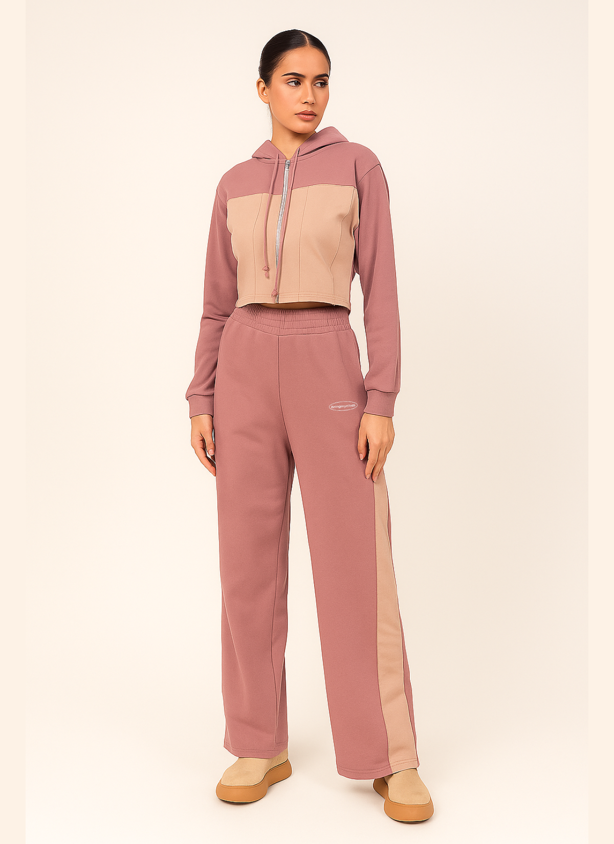 Designed to keep you effortlessly stylish, the set features a zip-closure cropped hoodie paired with straight-fit joggers, blending comfort with a clean, modern silhouette.